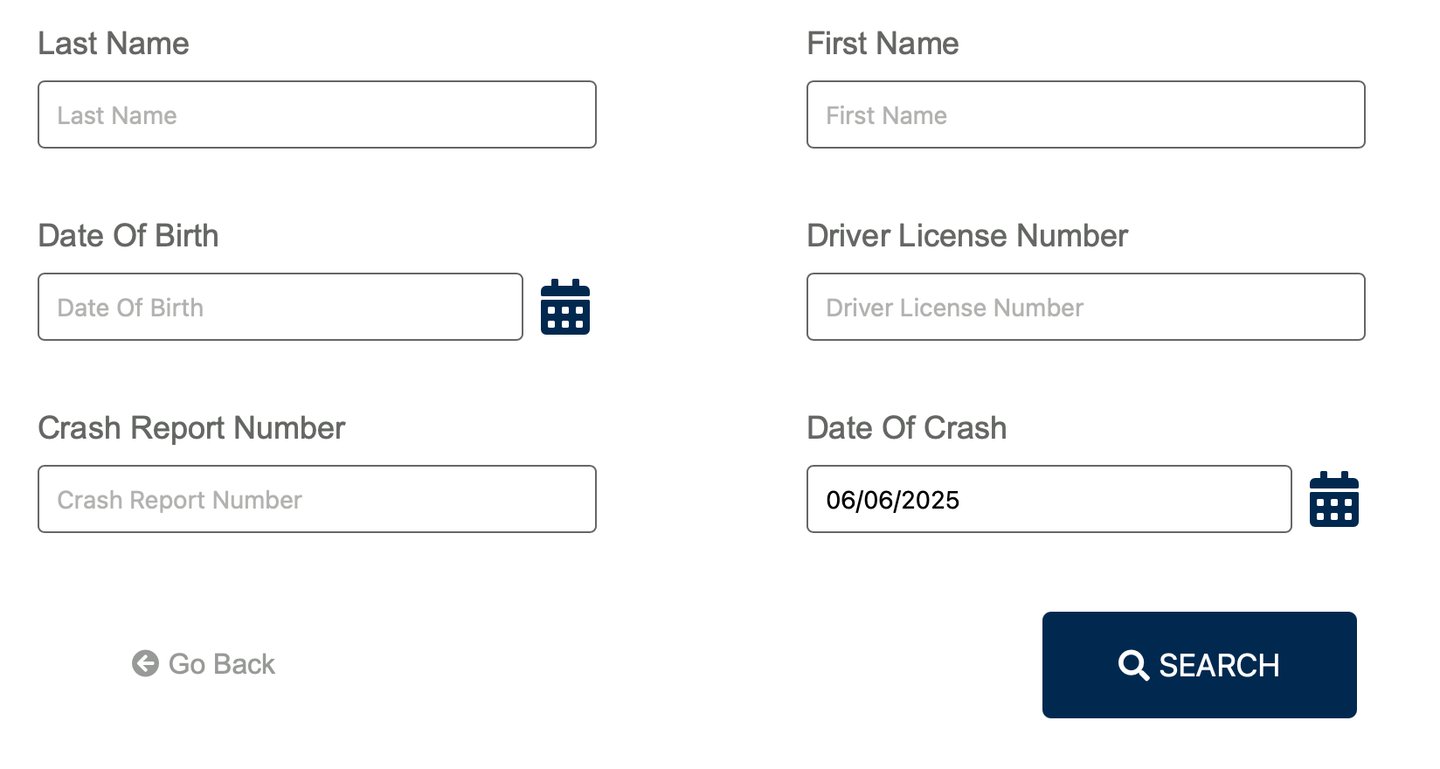 Once there, you can search the crash by a number of variables: date of the crash, report number, name, etc. (you only have to use one identifier. A simple date will suffice, although a report number or drivers license number will help narrow down your search).