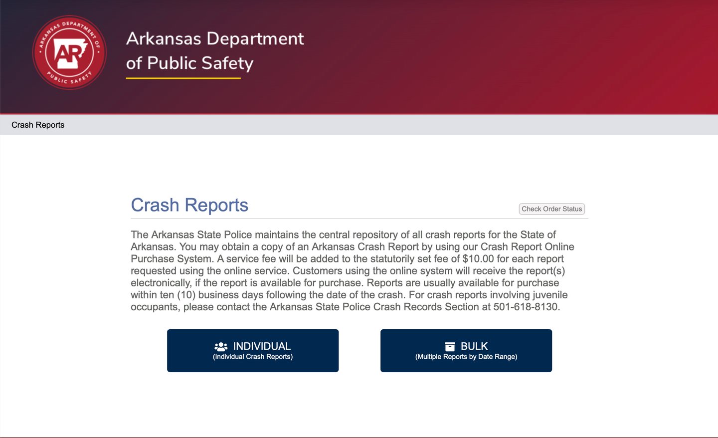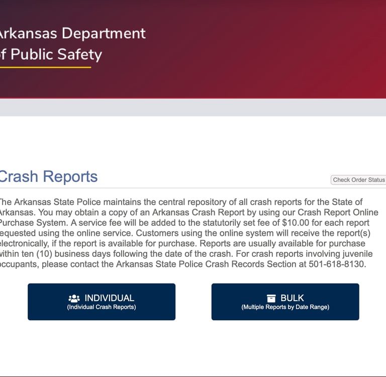 From there, click on the first option on your search engine, which should be "Crash Reports: Arkansas State Police." This will take you to the Arkansas Department of Public Safety Website's crash search database. Once there, select "Individual Crash Reports," which will take you to the search panel.